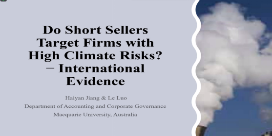 首先,苏坤老师对Haiyan Jiang副教授进行了简要介绍。随后,Haiyan Jiang副教授以“Do investors take climates into consideration while making investment decisions?” 问题启发在座师生对气候风险与投资者的投资决策之间的关系进行思考。此次讲座中,Haiyan Jiang副教授从气候风险的研究背景出发,深入探讨气候风险(碳排放强度和碳绩效)与卖空活动之间的关系,以及外生事件ETS对上述两者关系的影响。除此之外,Haiyan Jiang副教授进一步讨论企业的气候风险对卖空活动的具体机制。